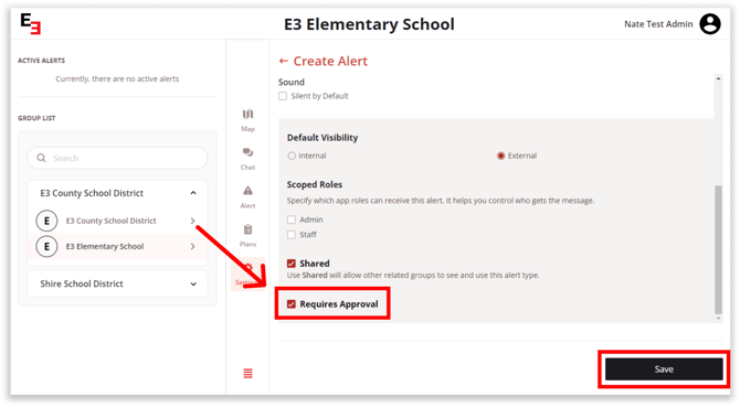If a user sends an alert with the "Requires Approval" setting toggled on, it will need approval before being sent out.