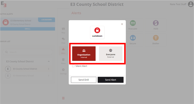When an administrator triggers an alert, they’ll choose between Internal or External.