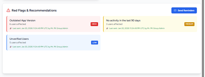 You can send reminders individually or blast a notification to all users from the Dashboard. Sent reminders are logged, showing who sent them and when.