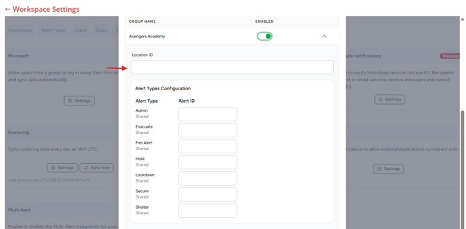 Next Enable the Group and click the drop down menu. Then paste the Location ID into the field. Do this for all groups you'd like to enable.