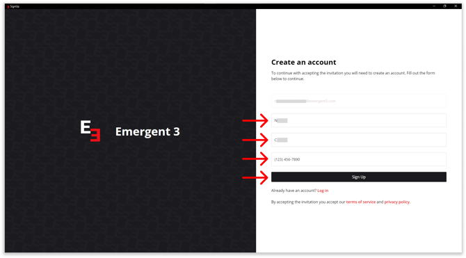 As you launch E3, you will see a form where you can enter your details. Fill in the form and click Sign Up to create your account.