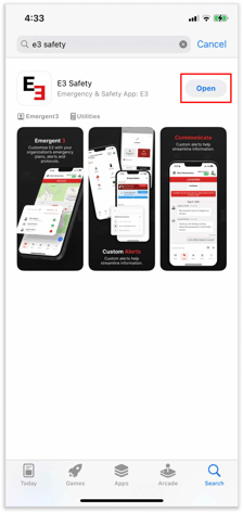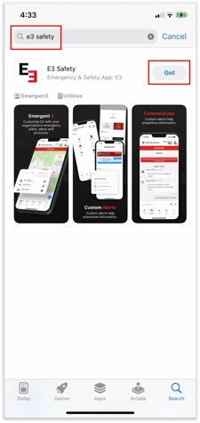 Open the App Store, search for "E3 Safety", and tap Get to download the app.