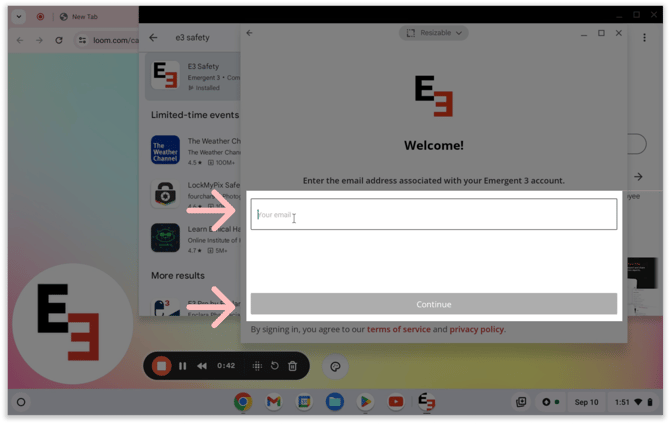 Enter your registered email with E3 and click Continue to receive a 6-digit log in code from your email inbox.