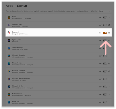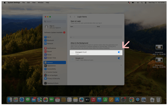 Find Emergent3 LLC in the “Allow in the Background” list and toggle it On.