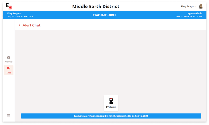 In the alert view, review the tabs: General Info, Analytics, Chat, Logs, and Check-In List.